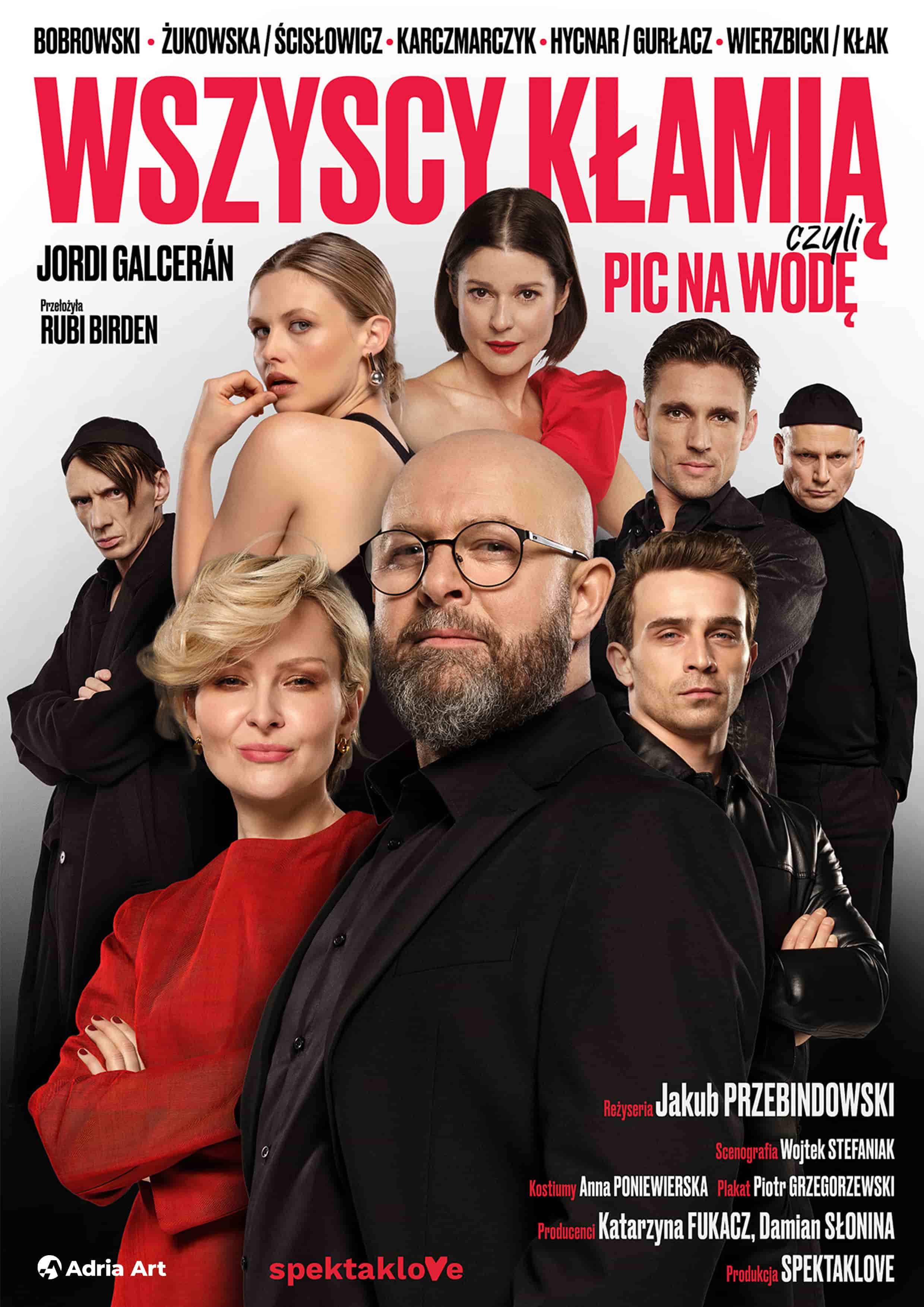 W spektaklu „Wszyscy kłamią, czyli Pic na wodę” główny bohater – Igor Galiński – w jednej chwili traci wszystko: władzę, pozycję i rodzinę. Gdy jego świat legł w gruzach, niespodziewane spotkanie z tajemniczą kobietą staje się początkiem szalonej i nieprzewidywalnej przygody, pełnej emocji, flirtu i ryzykownych decyzji.